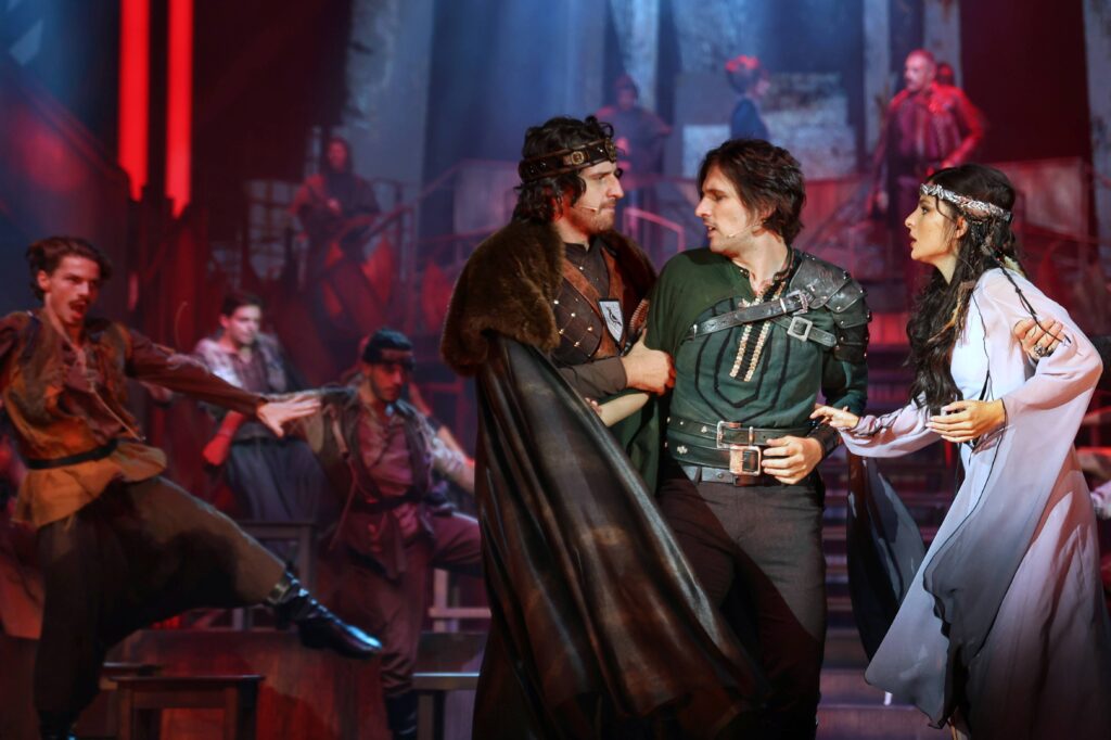 Amelyik kapott pénzt, paripát, fegyvert. Máshol már írtam arról, hogy mit gondolok erről, ez ennek a kritikának nem tárgya. Ám örülök annak, hogy egy lényegében bezárt színház kinyitott, és profik, olyanok csinálják, akik feltehetően majd meg is tudják tölteni. Még ha olyan produkciókkal is, amelyeknek egy része nem feltétlenül az én ízlésem, de a megcélzott közönség örömét leli bennük, megtalálja a számítását. Lényegében A trón is ez az eset. Kétség nem fér hozzá, hogy mindenki bedob apait-anyait, hogy sok tehetség összpontosul a deszkákon, érezhetően csapat van formálódóban. Ezt mindig, ahogy ezúttal is, fölöttébb szeretem. Persze a musical műfajából is ered, ám a hű, de erős hatások agyonhalmozását, a gyakran erőszakos hangosságot kevésbé. Szeretném, ha kevesebbszer kellene velünk szembefordulva tulajdonképpen bekonferálni, hogy milyen szituáció, mikor és hol következik, ha lenne olyan cselekmény, amiből ez magától értetődően kiderül. Ha miközben nyilvánvalóan ismeretterjesztés is folyik, nem kapkodnák történelemben kevésbé jártasak még így is időnként a fejüket, hogy ki kicsoda és mit akar pontosan. A rockos, de nem ritkán táncdalosan könnyed zenét nem mindig érzem a fajsúlyos témához passzolónak.