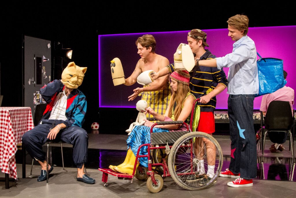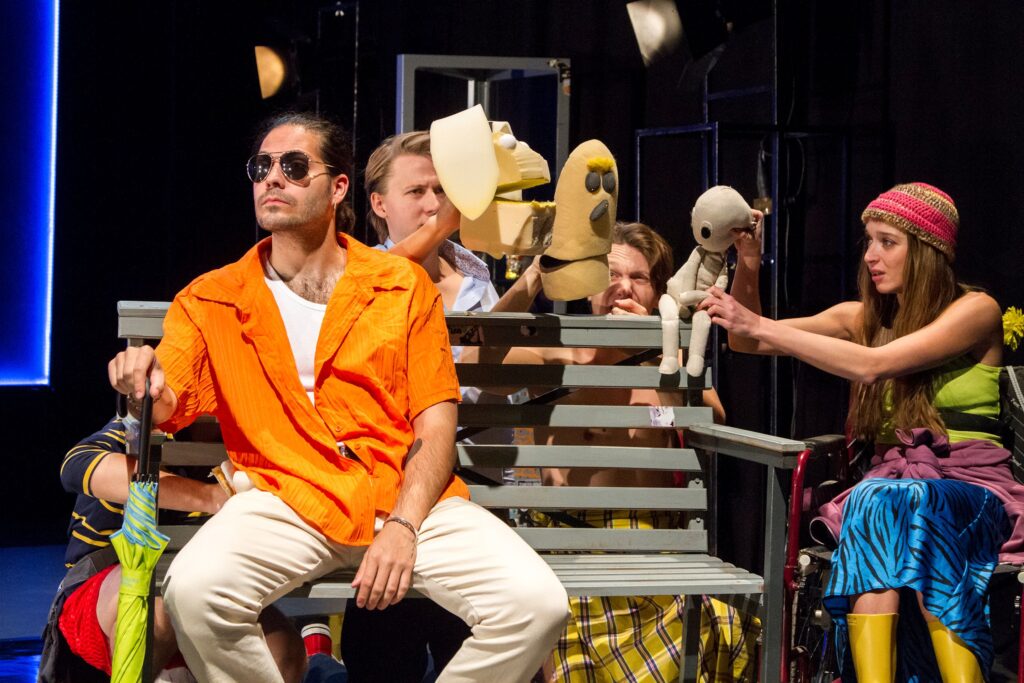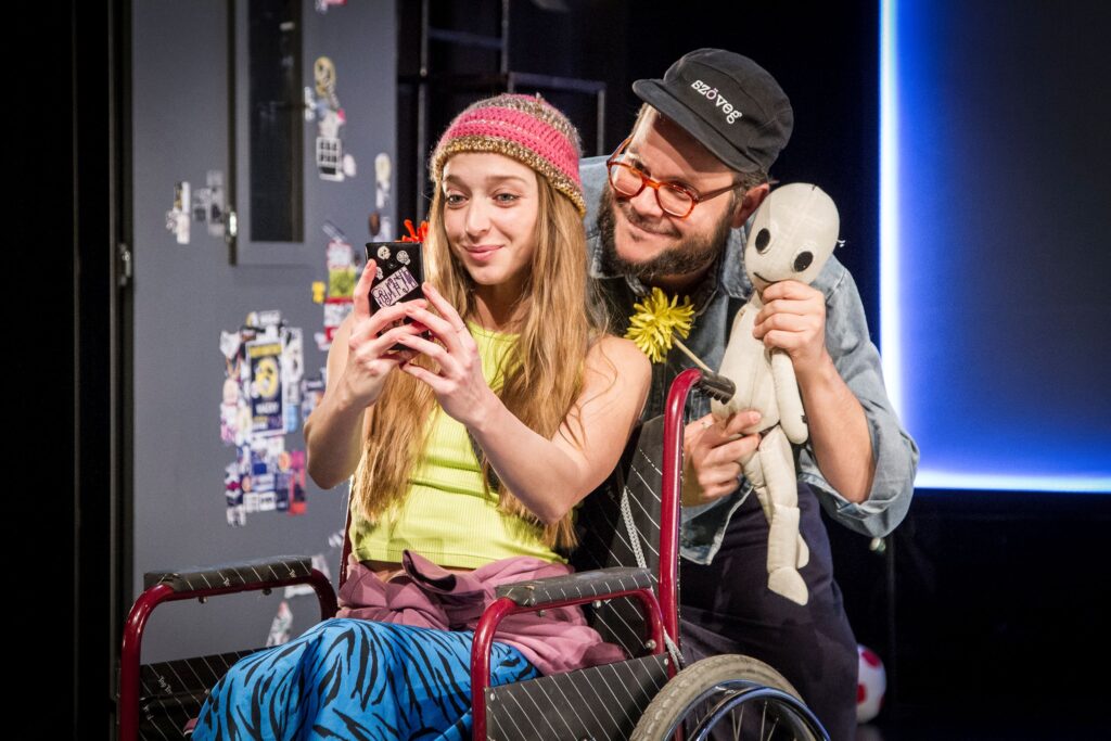 Ezúttal a bábok használata számomra a szereplők tudathasadását jelzi, azt, hogy nem tudnak dönteni, önmaguknak is visszabeszélnek, akár a végre kinyögött kijelentő mondat is netán rögtön kérdőmondattá változik. Kétely, kétely hátán. Eluralkodik a határozatlanság. Persze mindezt csak gondolom, és lehet, hogy gondolta a fene! Pass ugyanis ezúttal hangsúlyozottan rétegszínházat csinál. Közel sem olyan zsigerekbe hatolóan mindenki által közérthetőt, mint amilyen például a Bebújós volt, amiben óvodáskori megrázó eseményekről tudósított szintén a Jurányiban. Amúgy a színház honlapján fel is hívják erre a figyelmet, zenés színpadi road movie fiatal felnőtteknek és az ő ügyeikre nyitott egyéb korú érdeklődőknek ajánlva a produkciót.
