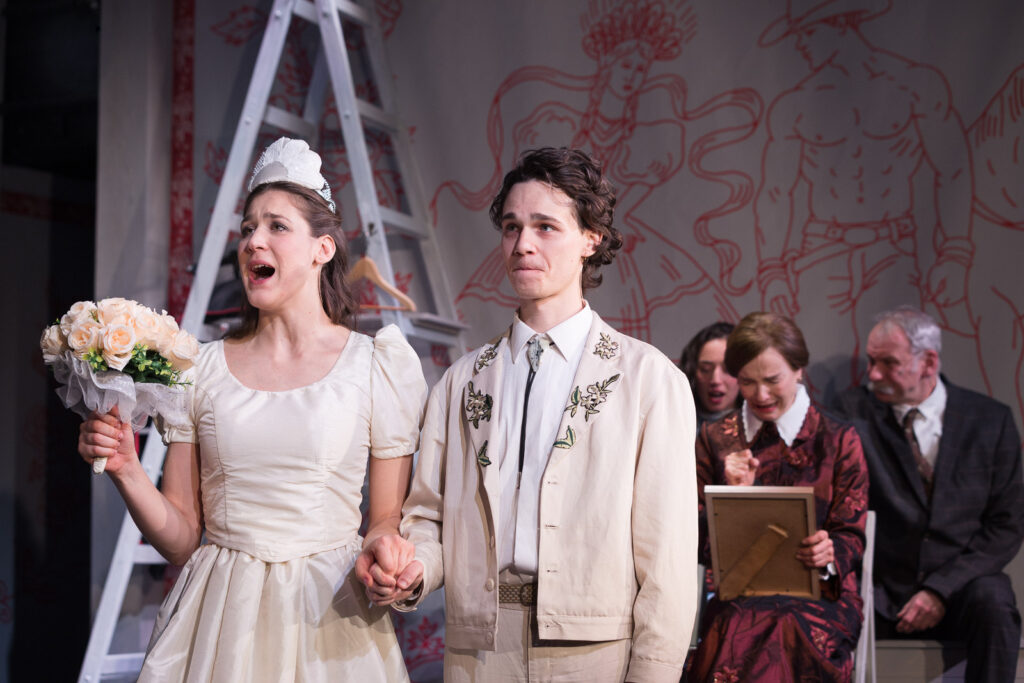 A balladai sűrűség, ami közben tragikus vétség bontakozik ki, ám ez akár könnyednek tűnő dalocskákkal, táncmozdulatokkal vegyül, melyek éles kontrasztba kerülnek a lesújtóan drámai eseményekkel. Először egy boldognak tűnő fiatal pár esküvőjére készülnek a színen. A Katona Péter Dániel által játszott Roland és terhes menyasszonya, Etelka, akit Kádár Kinga alakít, készülnek a nászra. Mintha repdesnének a boldogságtól. Dalra is fakadnak örömükben. Igen ám!, de Darvas Benedek zenéjébe már ekkor is vegyülnek disszonáns akkordok, kapásból érzékeltetve, hogy már ekkor sem fenékig tejfel minden, hát még később! Rolandba ugyanis a mostohatestvére, Julika, akit Berényi Nóra Blanka alakít, is szerelmes, és ő sem közömbös iránta. De ettől még minden menne a maga útján, és megtörténne az esküvő. Csak hát, Bata Éva megszemélyesítésében, Etelka anyja az utolsó utáni pillanatban előrukkol egy történettel a múlt sötét titkokat fedő homályából, ami szerint a házasulandók közeli rokonok, mert megcsalta a férjét, így nem is ő az apja az általa közösnek hitt gyermeküknek.