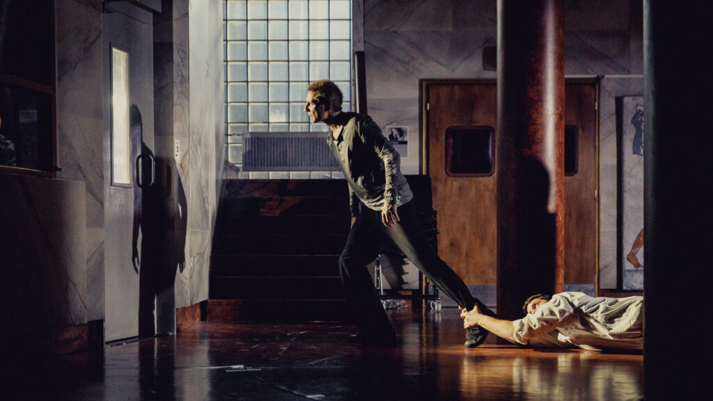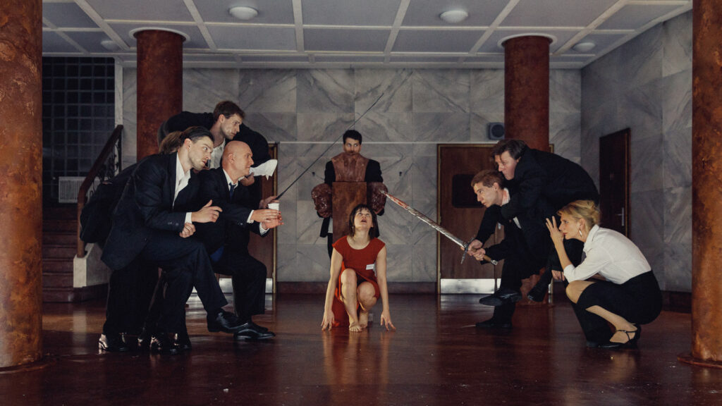 Schnábel Zita díszlete tényleg az eredeti aula lekoppintása, azzal a különbséggel, hogy ezúttal több minden megmozdul, vagy mozdítják, freskó, szobor, portásfülke előtti forgó korlát, miegymás, mintha inogna a talaj, kizökken a helyéből, mint Shakespeare művében az idő. A szereplők, Berecz István és Kondákor Ajsa Panka koreográfus által kiötlött mozdulatokat hajtanak végre, melyek gyakran szaggatottak, groteszkek, akár ideges rángatózásokra emlékeztetők.